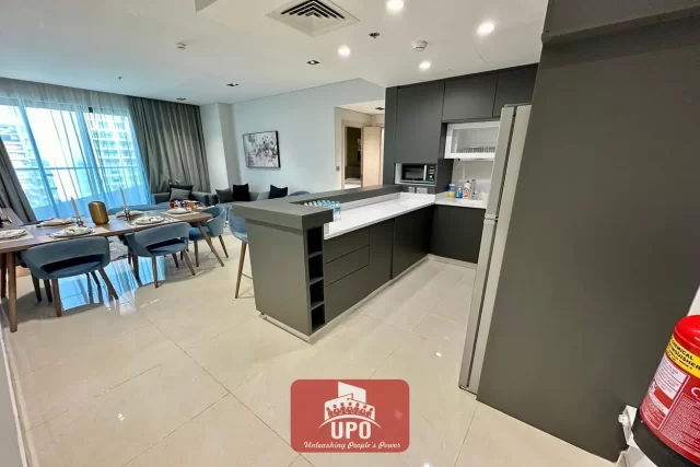 UPO Real Estate is pleased to offer you a beautifully Fully Furnished Modern One Master Bedroom Apartment in Lusail Marina with a Beautiful View from the Balcony. The open kitchen concept adds a touch of modernity and fosters a sense of connection between living spaces.